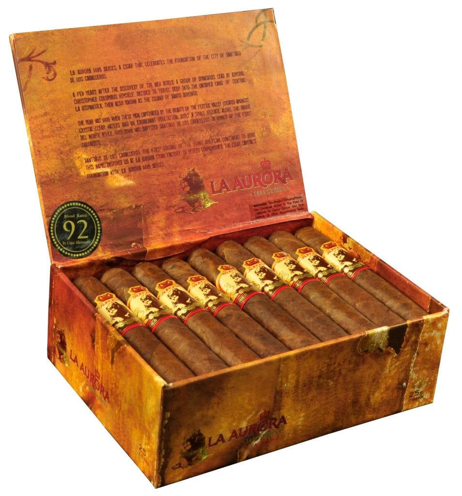 La Aurora 1495 Series Churchill es una edición especial que rinde homenaje a la fundación de Santiago de los Caballeros, la ciudad natal de La Aurora. Este cigarro de fortaleza media a alta presenta una capa ecuatoriana Sumatra, un capote brasileño y un relleno compuesto por tabacos dominicanos, peruanos, brasileños y nicaragüenses, creando una fumada compleja y equilibrada.